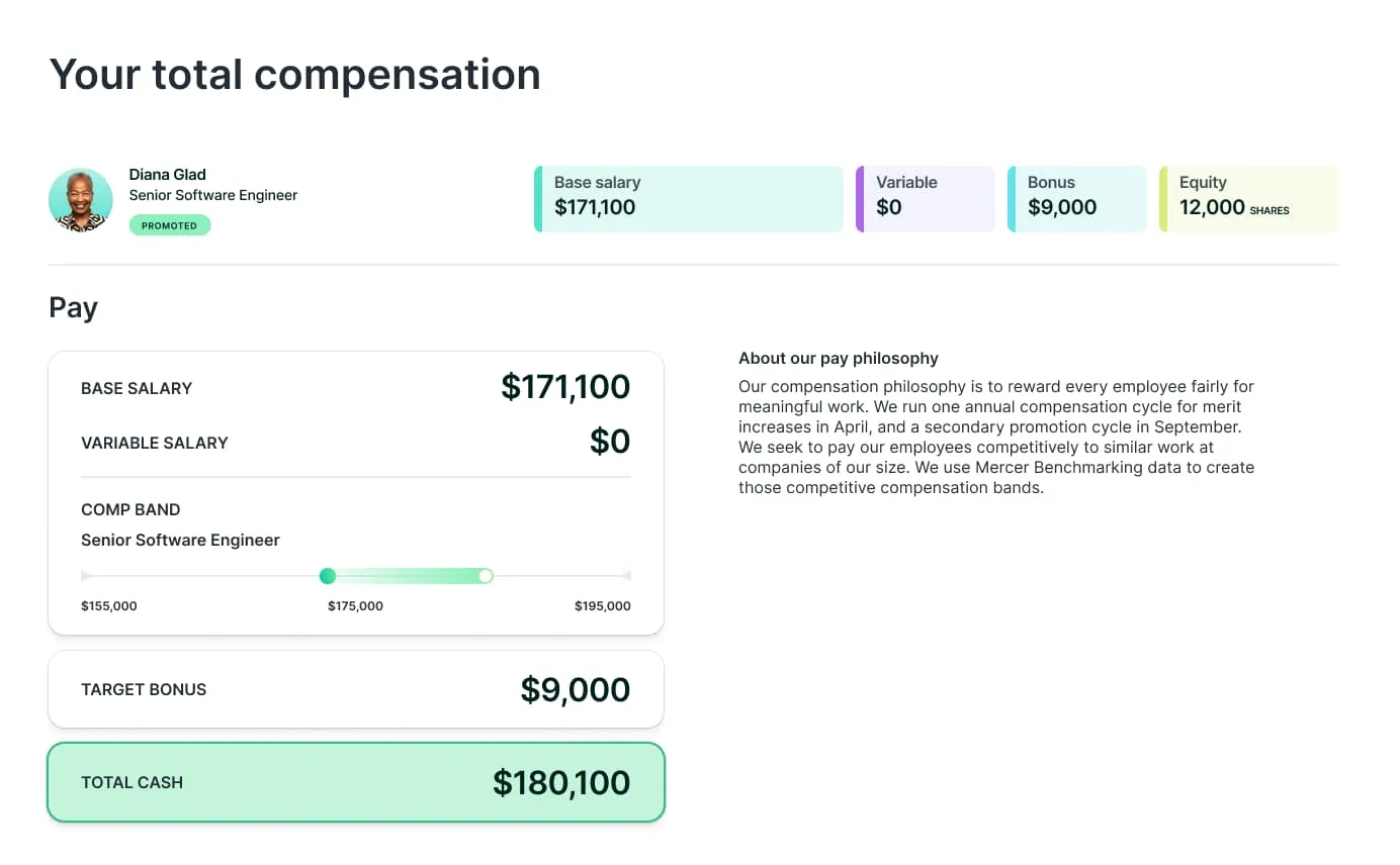 Provide valuable context behind pay decisions through sharable statements that explain adjustments and role-based compensation bands.