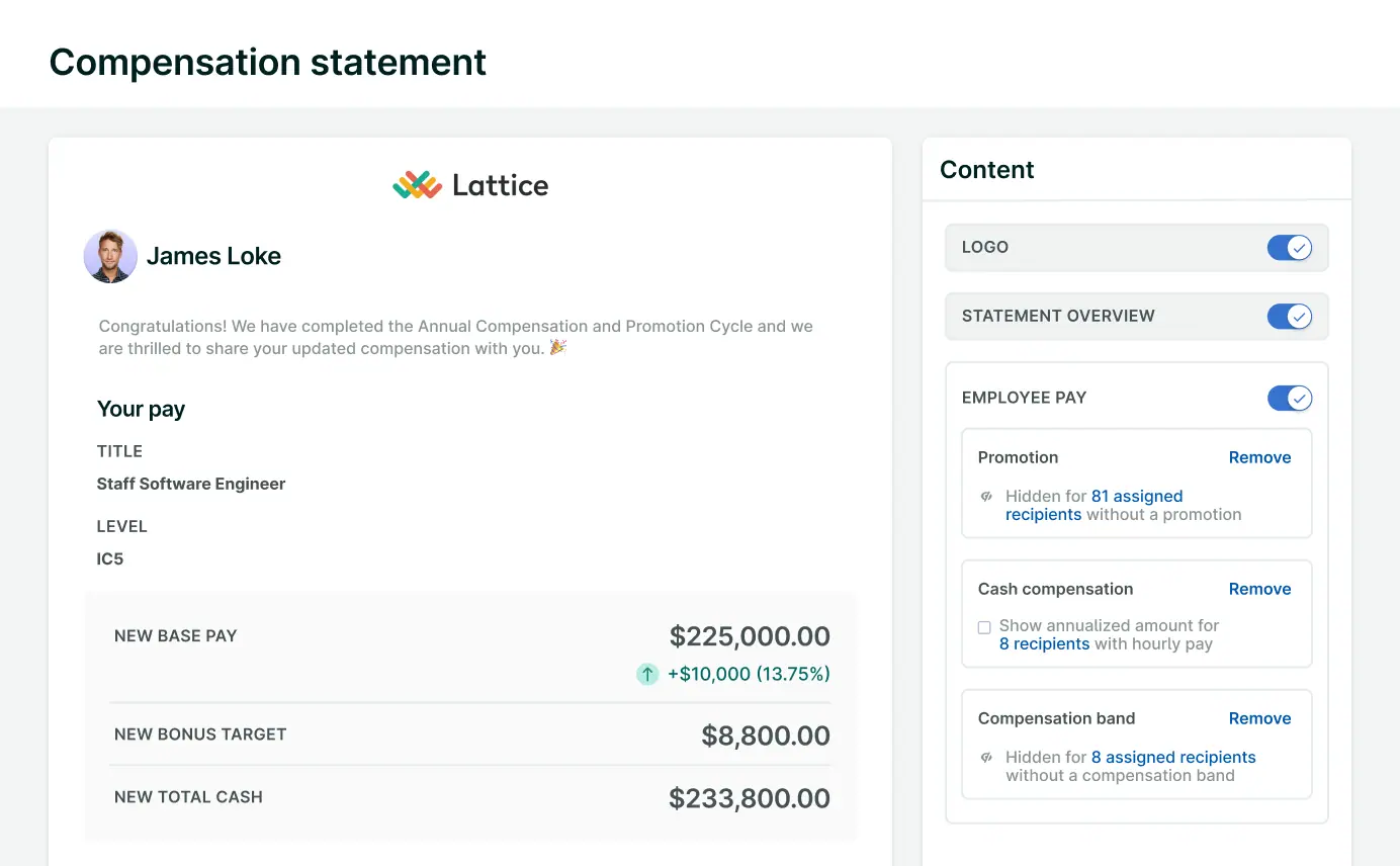 Once a compensation cycle is closed, Lattice enables organizations to customize and share compensation statements via managers or directly to employees, fostering pay transparency and clear communication regarding compensation changes.
