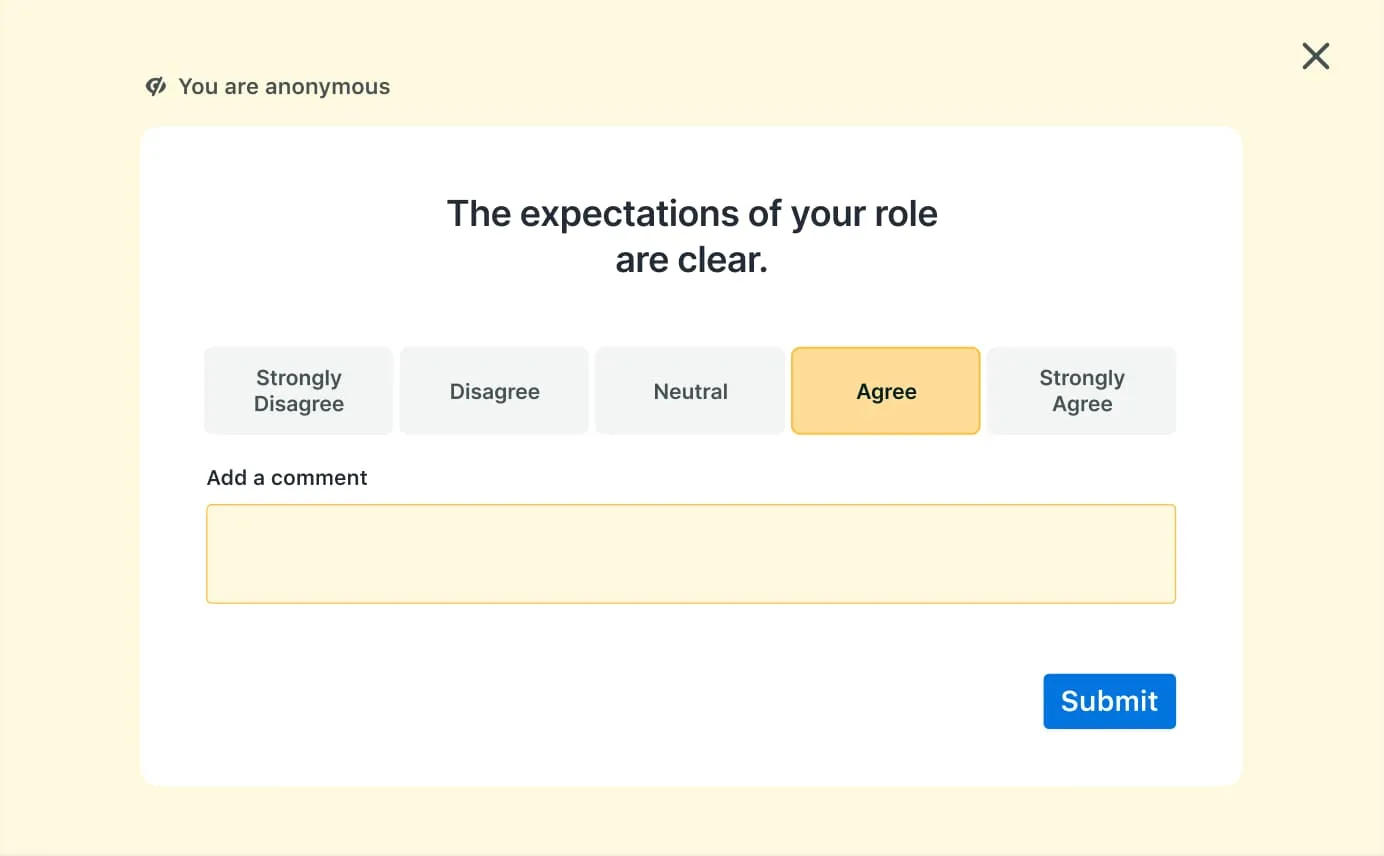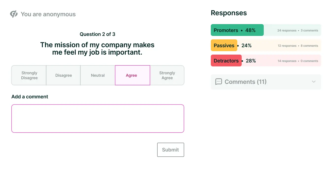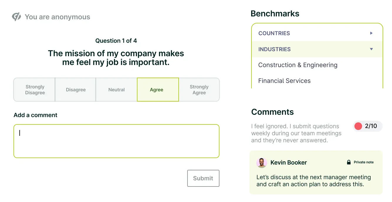 Work together with managers to respond to engagement survey feedback. Uncover great ideas, learn about your employees’ views, or address issues directly —  give employees anonymity so they can share their honest opinions.