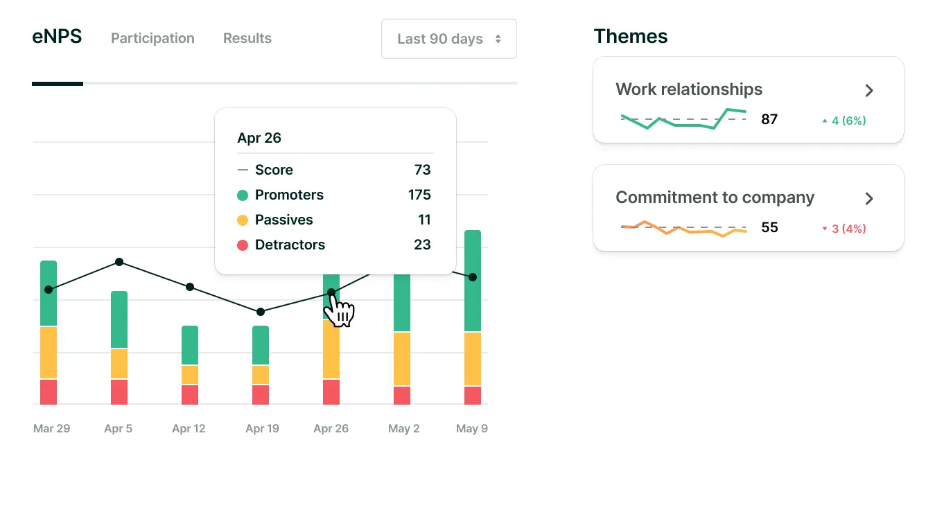 We love the ability to quantify where our employees stand in terms of themes in pulse and eNPS surveys. Data gives us the ability to have clear insight into our employee base and empowers us to create solutions to address challenges.