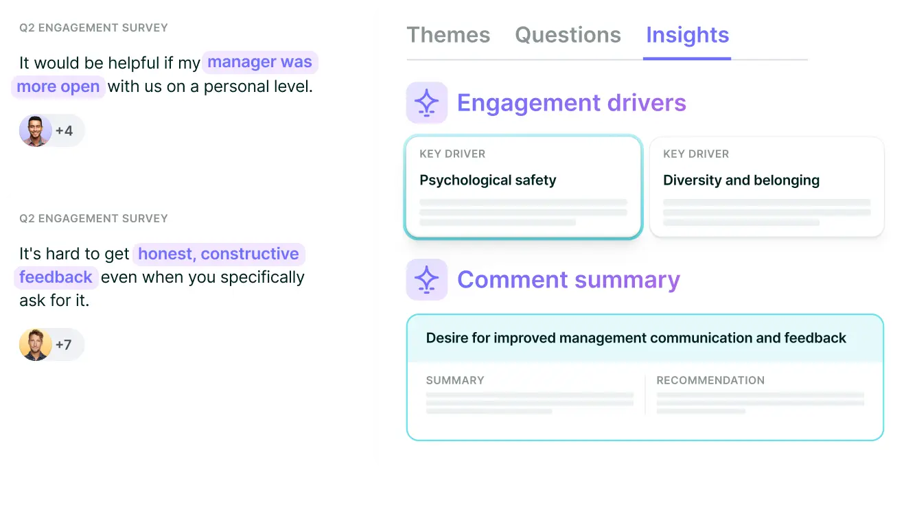Collect feedback, automatically surface AI-powered insights, and implement programs that improve productivity and retention.