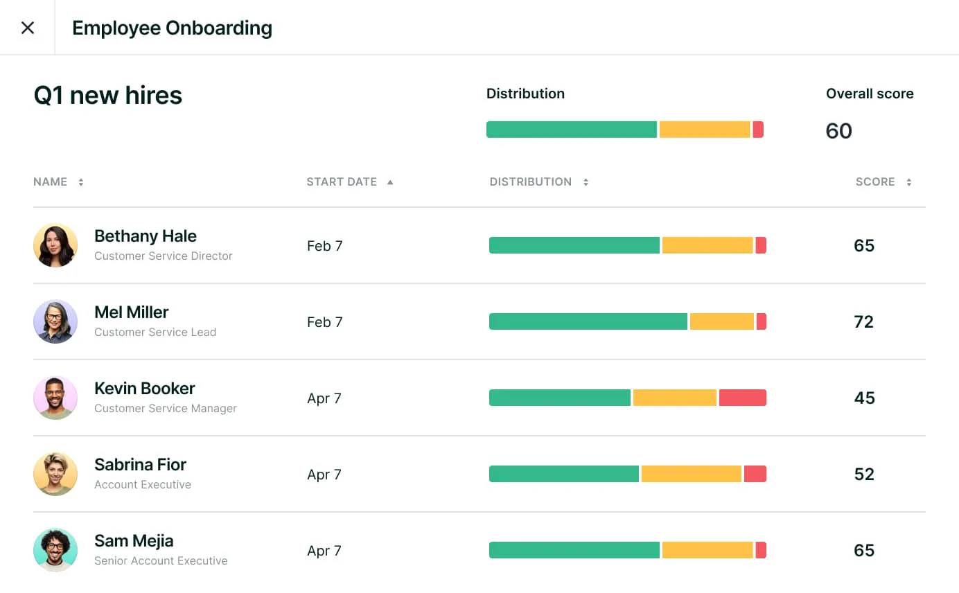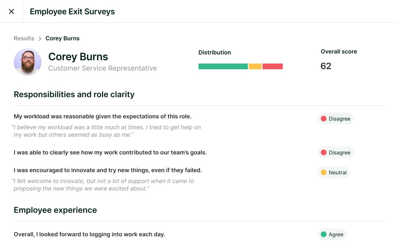 Individual scores are aggregated to give a quick snapshot of which employees to follow up with. Individual question responses can uncover successes or opportunities for improvement.