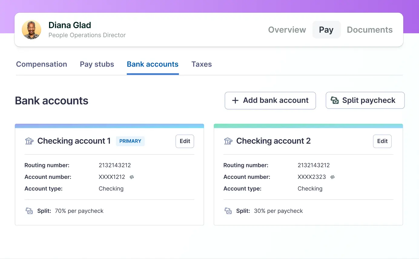 Let employees view and manage paystubs, bank accounts, and tax documents without asking HR.