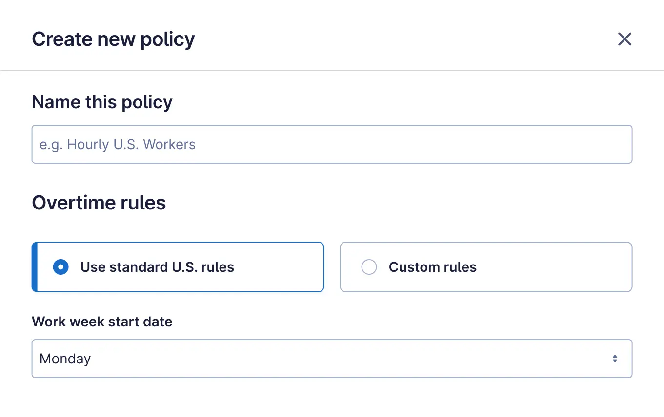 Configure time tracking policies, customize overtime rules, and ensure compliance with standard US labor laws.