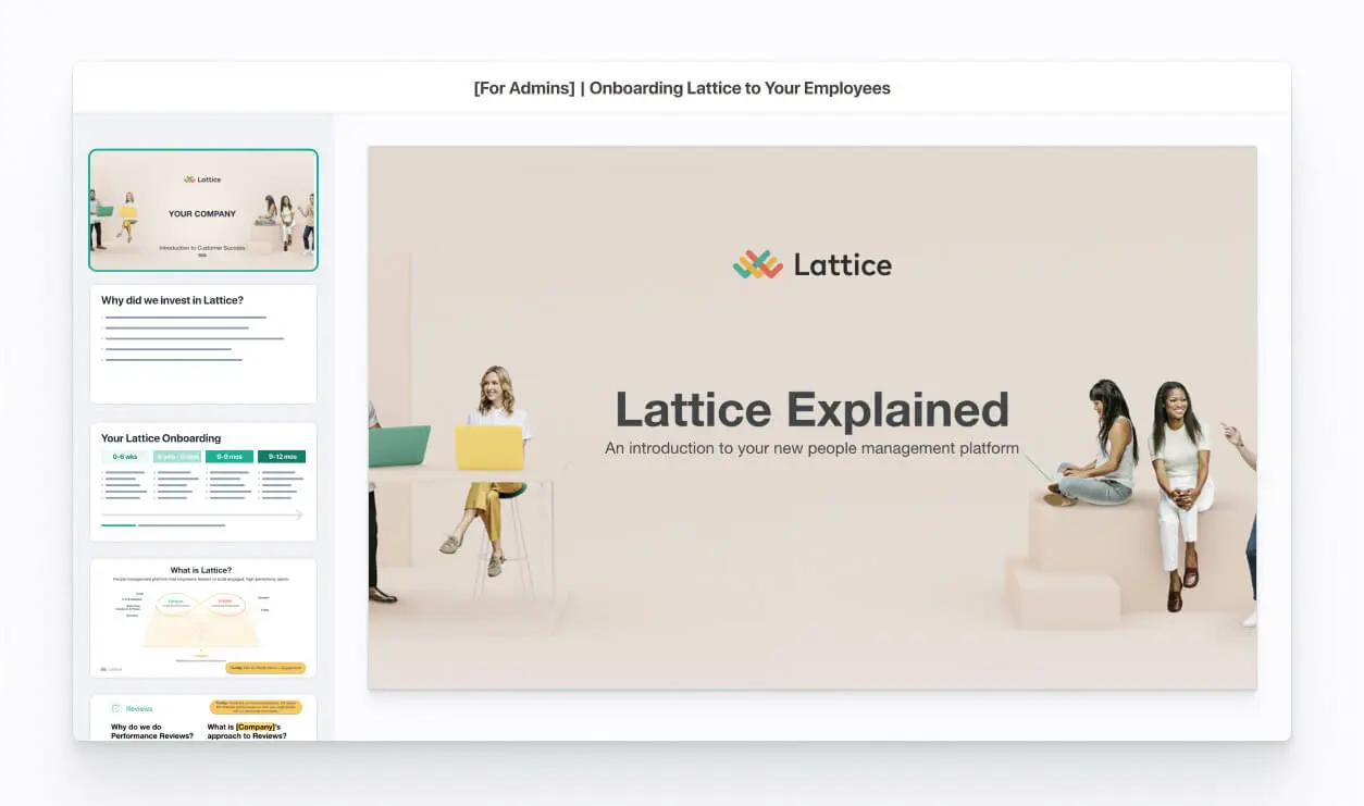 The Lattice Rollout Toolkits provides customizable resources to help overcome barriers and drive adoption of Lattice within your organization. From slide decks to email templates, every asset is customizable to your needs.